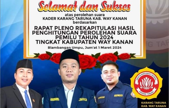 Saat dikonfirmasi Ketua Karang Taruna Way Kanan Abdullah Candra Kurniawan menerangkan, atas terpilihnya mereka bertiga sebagai anggota DPRD Way Kanan, meski masih menunggu penetapan oleh KPU.
