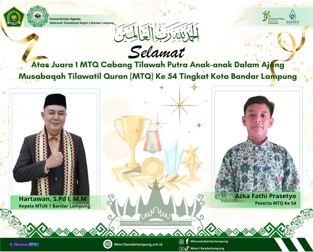 Potensinews.id — Prestasi membanggakan kembali diraih oleh siswa Madrasah Tsanawiyah Negeri (MTsN) 1 Bandar Lampung. Dalam ajang Musabaqah Tilawatil Quran (MTQ) ke-54 Tingkat Kota Bandar Lampung, siswa bernama Azka Fathi Prasetyo berhasil meraih Juara 1 Cabang Tilawah Putra.