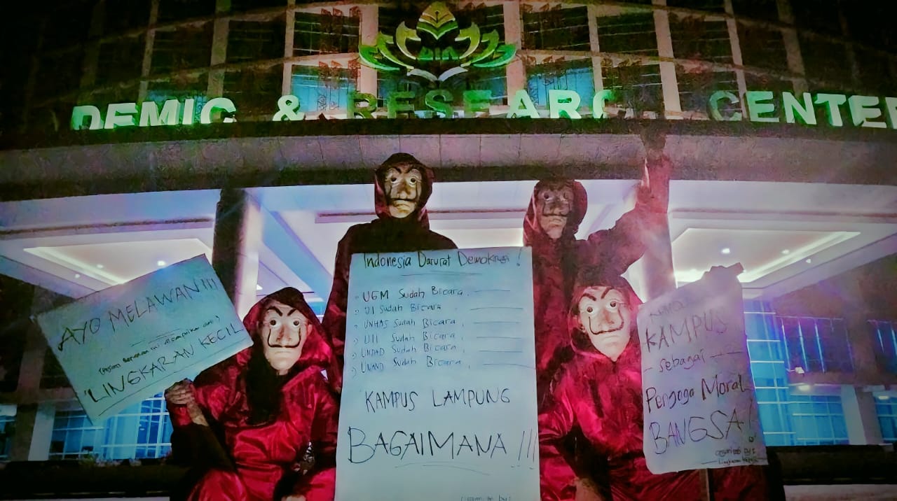 Potensinews.id, BANDARLAMPUNG – Sekelompok pemuda misterius menyuarakan aksinya di bundaran Tugu Air Mancur Universitas Lampung (UNILA) dan Halaman depan Rektorat UIN Raden Intan Lampung, pada Jum’at malam, (2/2).