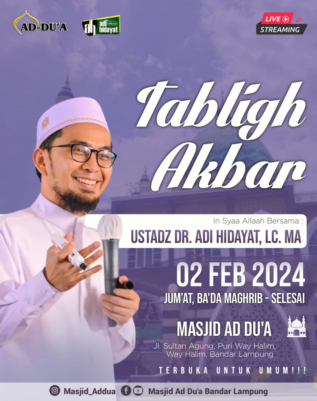Potensinews.id, BANDARLAMPUNG – Ustadz Adi Hidayat yang akrab disapa UAH, dijadwalkan untuk kembali mengisi kajian keislaman di Masjid Ad Du’a, Jalan Sultan Agung, Puri Way Halim, Kecamatan Way Halim, Kota Bandarlampung.